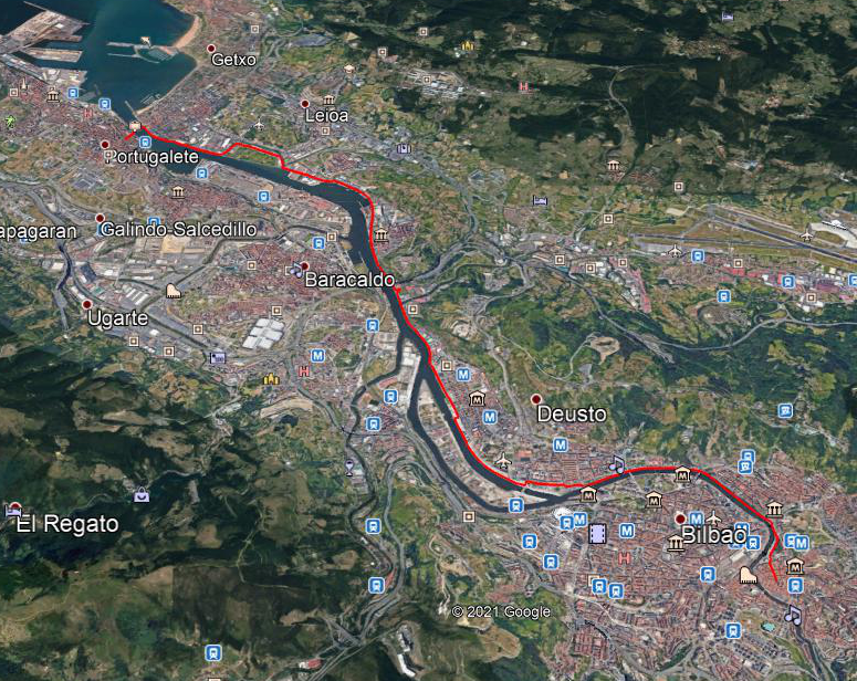 Este itinerário pela margem direita da ria del Nervión é uma alternativa que retira 5,9 kms em relação ao caminho oficial; a rota não tem oscilações, é totalmente plana e está sinalizada com setas amarelas a partir da ponte Euskalduna. o seu trajeto passa em frente à Câmara Municipal e ao Museu Guggenheim em Bilbao e finaliza atravessando a Ponte Colgante entre Getxo e Portugalete. A quem considere a etapa curta, pode facilmente continuar até Pobeña, já fora da tormenta metropolitana.