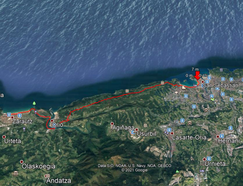 Outra etapa maravilhosa de caras para o mar; quem o deseje pode encurtá-la, pernoitando no albergue de Orio. À saída de San Sebastián enfrentemos uma curta mas forte subida ao Monte Igueldo; logo, avançamos num longo percurso em subida ligeira; e, finalmente, por um belo trilho descemos a Orio. De Orio a Zarautz superamos outras duas modestas colinas; a descida final regala-nos preciosas vistas de Zarautz e de Getaria e o seu “ratón”.