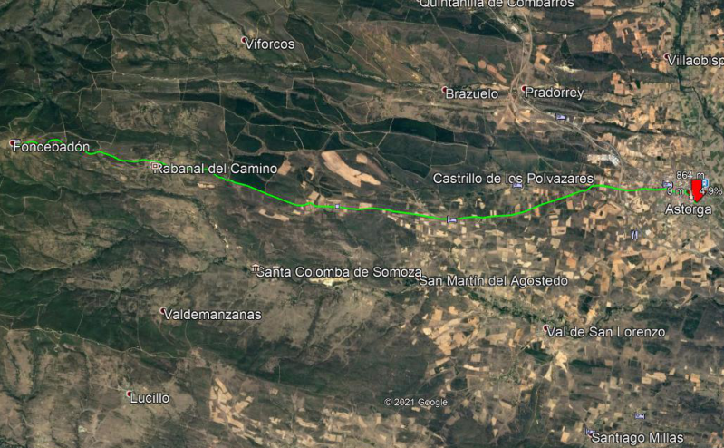 Embora os peregrinos enfrentem a parte mais difícil da subida, os desníveis não costumam exceder 6%. O caminho continua sob a linha de eletricidade até descer novamente para o asfalto, que deve ser percorrido por mais 400 metros para chegar a Foncebadón, a última localidade Maragata que assenta numa colina. Apesar da localidade ser praticamente desabitada, o caminho está em perfeito estado. Um largo caminho pedregoso que se afasta para a esquerda conduz os caminhantes exaustos até ao albergue da paróquia.