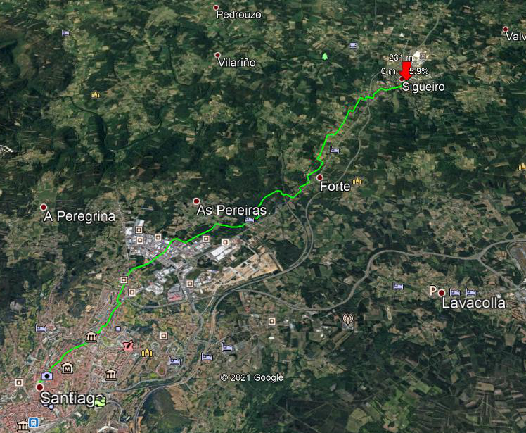 No terreno, é um dia de dificuldade média, embora de curta distância. O peregrino pisa no asfalto e na terra até aos últimos 4 quilómetros, quando entra no centro de Santiago de Compostela ao longo das suas ruas urbanas. Existem apenas algumas encostas moderadamente íngremes que testam as pernas após dias de caminhada, embora não falte sombra ou abrigo para recuperar as forças. Também não faltam pontos de abastecimento, pontilhados ao pé da estrada nacional, paralelos ao percurso do Caminho dos Peregrinos para Santiago de Compostela.