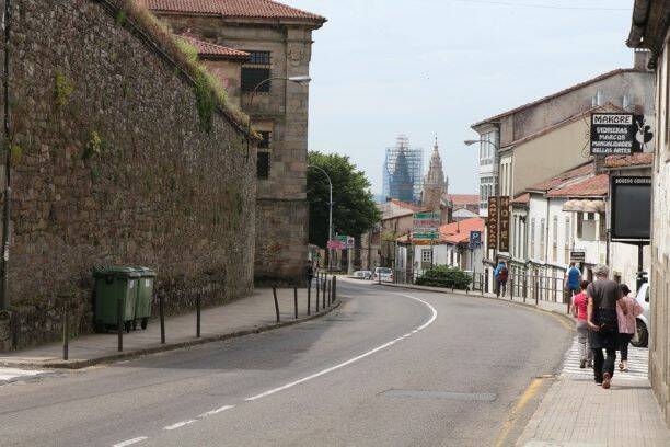 Ao entrar na zona industrial, deparar-se-á com o Café Bar Polígono, onde servem o pequeno-almoço e almoço a um bom preço. Há também máquinas de venda automática à porta. A partir daí atravessa-se a zona industrial em linha reta, passando duas rotundas até chegar à frente do cemitério amuralhado de Santiago, onde começa a Calle de las Mulas. O percurso encontra então a Rua Tambre, no cruzamento da qual existem bares e churrasqueiras. Alguns passos mais à frente, do lado direito, encontra-se uma farmácia. Esta é a entrada para a zona urbana de Compostela e restam apenas algumas centenas de metros para ver a catedral. A nova localização dos marcos, acima mencionada, implica também um desvio da rota original, que passava por Meixonfrío, onde havia uma estalagem em que os peregrinos se refrescavam. No entanto, seguindo o itinerário atual, saímos da rua Tambre e viramos à direita para a rua do Rio. É uma zona residencial com ruas dispostas em grelha, embora não seja necessário entrar em nenhuma delas, mas será necessário subir uma encosta de cerca de 100 metros para virar à esquerda imediatamente a seguir, contornando a urbanização pela rua Camiño do Vilares. Numa ligeira descida, o perfil do templo é finalmente alcançado pelo peregrino, a pouco menos de dois quilómetros de distância. Uma curva acentuada para a esquerda guia, ao longo da rua Guadalupe, para alguns degraus junto à Ponte Mantible, um aqueduto medieval construído pelo arcebispo Diego de Xelmírez no século XII para abastecer a cidade face à chegada próspera de peregrinos e comerciantes.