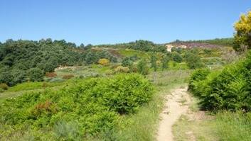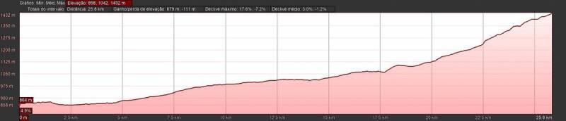 Neste ponto, recomenda-se que os ciclistas continuem a subir à direita e ao longo da estrada, pois é difícil para os caminhantes continuarem ao longo do caminho de terra batida. Atravessam a estrada e tomam um caminho estreito que os afasta do asfalto e depois de uma longa subida de mais de meio quilómetro até um novo cruzamento com o asfalto. Atravesse a estrada e continue em linha reta ao longo de um caminho ligeiramente mais largo que avança por cima dela. Após mais de 1 quilómetro chega-se a alguns bancos onde se pode descansar ou refugiar-se, para recomeçar e sempre subindo, os quilómetros restantes da etapa. A montanha, sobre a qual os piornos, juníperos e vassouras ganham terreno, começa a oferecer aos caminhantes vistas prodigiosas das montanhas próximas e, atrás, de toda a região.