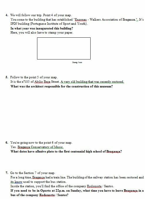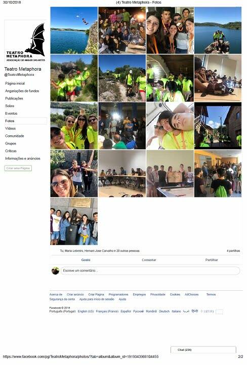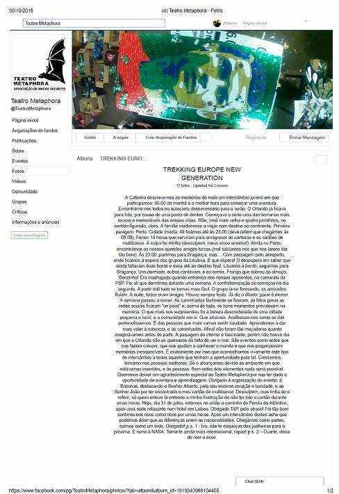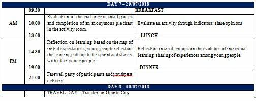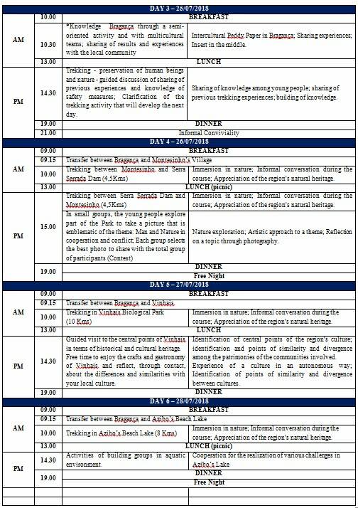 Food: breakfast in a bar next to the accommodation, lunches and dinners in a social security canteen in Bragança, two restaurants in the city, a school canteen and a partner association made by Enzonas elements and snack at mid-morning and mid-afternoon at the place of activities.