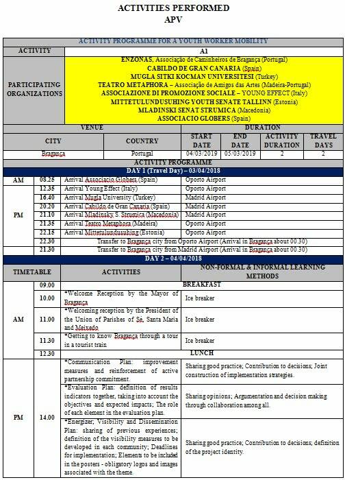 In the APV and exchange: the travels were purchased by Enzonas, taking into account available funding and budgets sent by organizations or reimbursed to partners. Enzonas also covered activity insurance for all participants, which covered the length of stay of participants in the country, so that any risk was reduced and, under the guidance of each organization, each participant addressed the acquisition of their European Health, where applicable. Participants also had access to emergency contacts. Accommodation and food were the responsibility of Enzonas who collected budgets and submitted the best proposal (with visual record and all necessary information) to the consortium for approval.